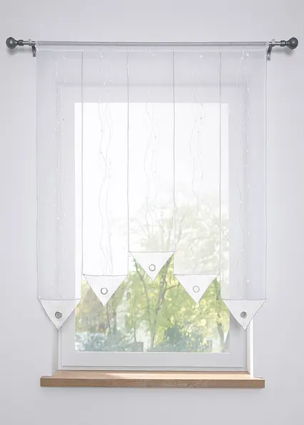 Dieser Scheibenhänger hat eine besondere Verarbeitung, denn die einzelnen Stoffbahnen sind oben durch den Tunnelzug verbunden. Jede Stoffbahn ist mit einer filigranen Stickerei, einem Dreiecksabschluss mit Öse versehen und ca. 20cm breit, d.h. die Breite ergibt die Anzahl der Stoffbahnen. Somit ist der Scheibenhänger eine besondere Dekoration und das nicht nur am Küchenfenster.