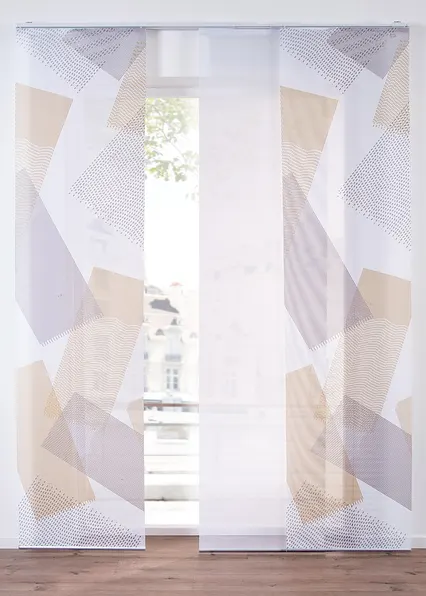 Schlicht und dennoch sehr dekorativ ist dieses Schiebegardinen-Set mit Digitaldruck und einfarbig. Die genaue Set-Zusammenstellung entnimmst Du dem Größenlauf.