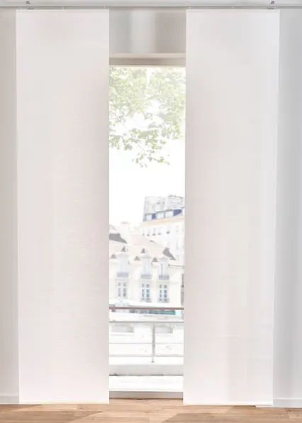 Der Flächenvorhang in modernem Design eignet sich nicht nur zur Fenster-Dekoration sondern auch als Raumteiler. Er hat eine tolle Optik und ist in weiß vielseitig einsetzbar.