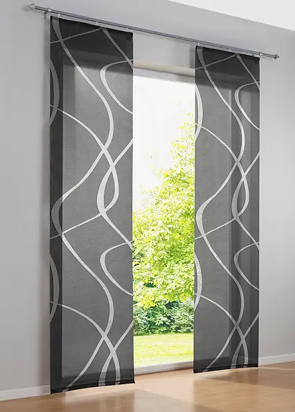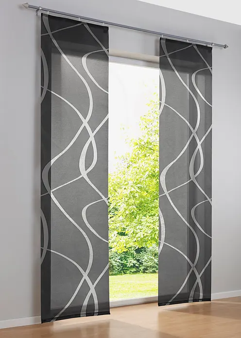 Moderne Schiebegardine aus halbtransparenter Stoffqualität. Das stilvolle Muster ist durch das Scherli-Verfahren hergestellt und hat somit trendige fransige Kanten. Erhältlich in verschiedenen attraktiven Wohnfarben.