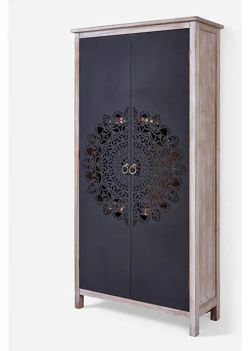 Verleihe Deinem Zuhause einen Hauch von Eleganz und Funktionalität mit unserem ausgefallenen Schrank. Die zwei Türen, verziert mit stilvollen Ringknöpfen, laden Dich ein, den Stauraum dahinter zu entdecken. Das gestanzte Muster auf den Türen sind ein kunstvolles Highlight und macht diesen Schrank zu einem echten Blickfang.