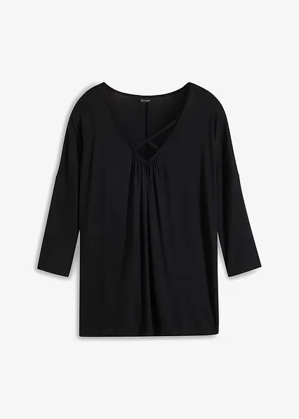 Passformvorteile:betont das Dekolleté, hüftbedeckend, mehr Komfort durch Stretch, streckender V-Ausschnitt