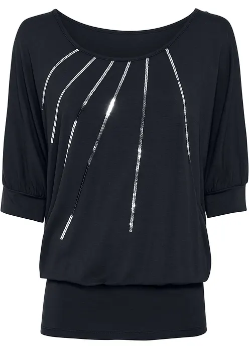 Dieses tolle Shirt der Marke BODYFLIRT ist zum Ausgehen und für die nächste Party eine gute Wahl. Schöne Details sind die funkelnden Pailletten auf dem vorderen Teil. Der besondere Schnitt verleiht dem Shirt mit weitem Rundhalsausschnitt, geradem Saumabschluss und halblangen Fledermausärmeln einen besonderen Look.Das Shirt lässt sich zu schmalen Stretchhosen oder figurbetonenden Röcken sehr gut kombinieren.
