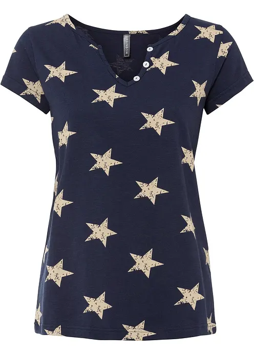 Das sportlich geschnittene Shirt aus reiner Baumwolle punktet mit einem trendy Allovermuster und einer raffinierten Kombination aus Rundhals- und V-Ausschnitt. Letzterer ist mit drei kleinen Knöpfen verziert.