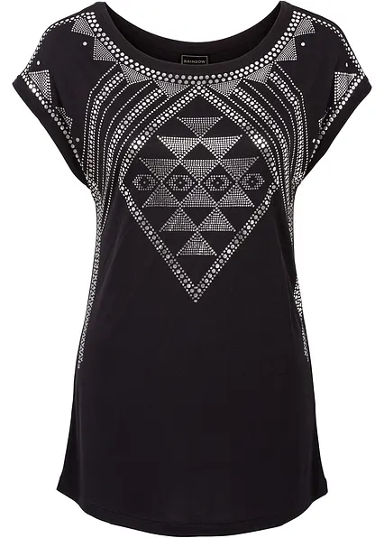 Das bedruckte Shirt ist ein stylishes Teil für angesagte Party-Outfits: Mit seinem großen Foliendruck auf der Vorderseite sorgt das Shirt für einen trendigen Look. Der lockere Schnitt mit Rundhals unterstreicht das lässige Design.Durch die Long-Form schmeichelt das Shirt der Figur. So lässt es sich super über einem Rock oder einer Leggings tragen. Dazu passen rockige Accessoires und Boots in Lederoptik.