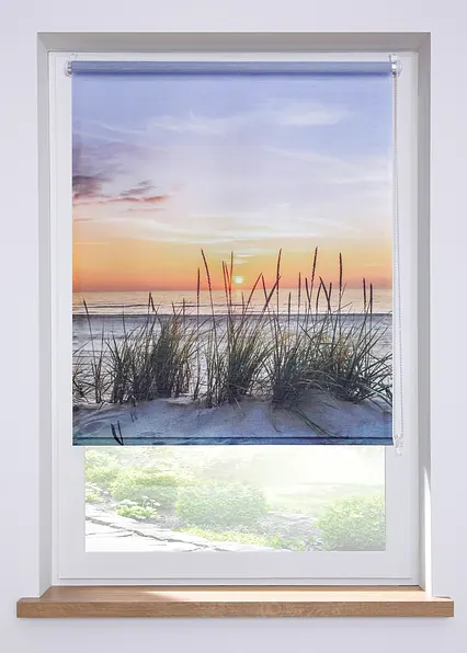 Sonnenuntergang am Strand! Hier kann man lange verweilen und träumen. Das stimmungsvolle Strand Motiv ist im Digitaldruck auf die Vorderseite angebracht und bietet Licht- und Sichtschutz, ohne der Raum komplett zu verdunkeln. Es ist stufenlos verstellbar und im mittels praktischer Klemmträger Nu angebracht.