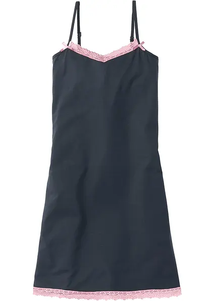 Dieses Nachthemd gibt Damen ein luftig-leichtes Tragegefühl: Es zeichnet sich durch einen lockeren Schnitt aus. Eine feine Spitzenkante in Kontrastfarbe ziert Saum und Ausschnitt des Modells. Zwei hübsche Schleifen runden die geschmackvolle Optik ab.Die schmalen Spaghettiträger sind individuell verstellbar.