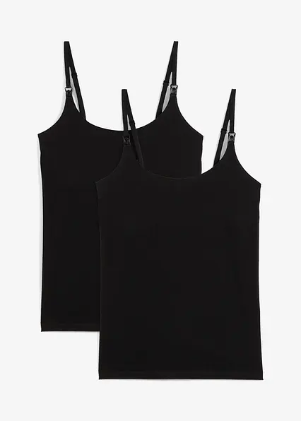 Weiche Stilltops aus Jersey aus Bio-Baumwolle mit schmalen verstellbaren Trägern und einem funktionellen Verschluss, der ein disketes Stillen ermöglicht. Darunter befindet sich ein leicht stützendes Innentop mit einem elastischem Saum.