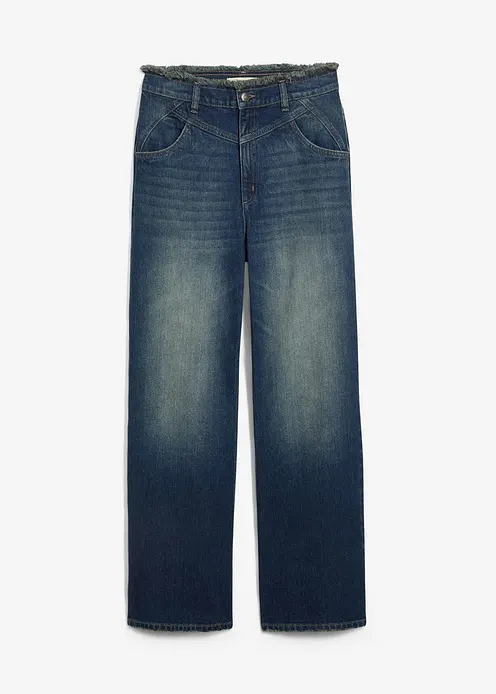 Gerade 5-Pocket-Jeans aus einem festen Baumwolldenim, der sich zunächst etwas steif anfühlt und durch häufiges Tragen weicher und lockerer wird. Hohe Bundhöhe mit Zip Fly und Knopf. Lange Länge, dass am Fuß ein leichter Satcking-Effekt entsteht. Diese Jeans hat durch das ausgewaschene Finish einen modischen Used-Effekt erhalten. Eine leichte Farbabgabe beim Tragen und in der Wäsche sind charakteristisch für diese Jeans. Innenbeinlänge in Gr. 42 ca. 78,5cm, maschinenwaschbar.