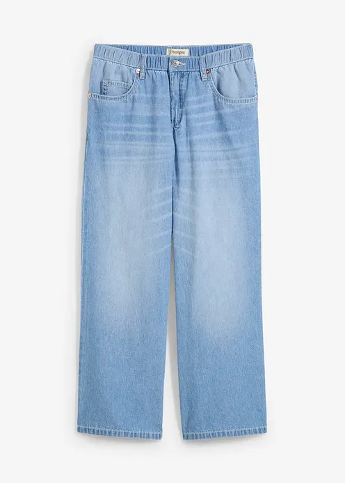 Lockere Gerade 5-Pocket-Jeans mit elastischem Bequembund aus einem festen Baumwolldenim, der sich zunächst etwas steif anfühlt und durch häufiges Tragen weicher und lockerer wird.Mittlere Bundhöhe mit Zip Fly und Knopf. Cropped Länge. Innenbeinlänge in Gr. 42 ca. 64,5 cm, maschinenwaschbar.