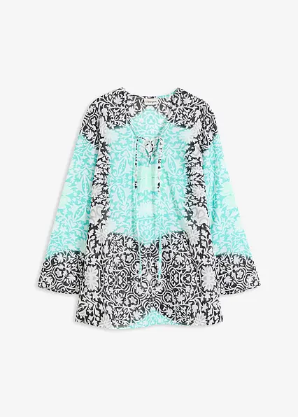Mit dieser Tunika sind Sie am Strand im Nu stilvoll gekleidet. Als modische Ergänzung zur Bademode zeigt sich die Strandtunika mit einem tiefen Ausschnitt, der geschnürt werden kann. Die langen Ärmel sind ausgestellt. Das Modell hat seitliche Schlitze und überzeugt mit einem weichen Griff.Durch die transparente Optik lässt die Tunika von bpc selection einen darunter getragenen Badeanzug oder Bikini durchscheinen.