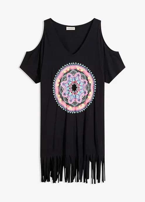 Schulterfreies Strandkleid mit plaziertem Druck und Fransensaum.