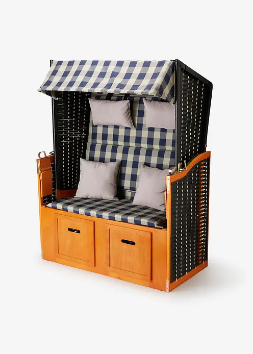 Reinsetzen, Füße hoch und wohlfühlen. Strandkorb mit 2 Klapptischen und Fußablagen. Die Rückenlehne kann in 4 Stufen bis zu 45 Grad Liegeposition eingestellt werden. Im Lieferumfang enthalten sind Sitz-, Rücken- und Fußpolster sowie Kopf- und Zierkissen.