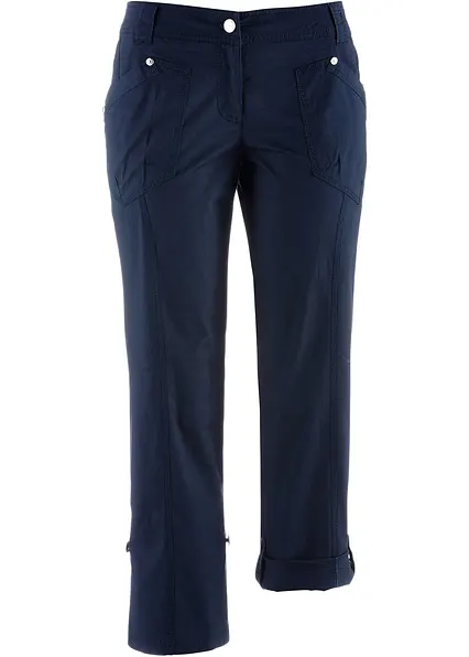 Bequem erweitert diese Stretch-Cargohose in 3/4-Länge den Kleiderschrank um ein Modell für den freizeittauglichen Look. Die Hose der Marke bpc punktet mit praktischen Taschendetails auf der Vorderseite. Zwei weitere Taschen zum Knöpfen finden sich am Gesäß.Die Beinlänge der 3/4-Stretch-Cargohose lässt sich mittels Knopf und Riegeln nach Belieben variieren. Längsnähte im angepassten Farbton strecken optisch das Bein.