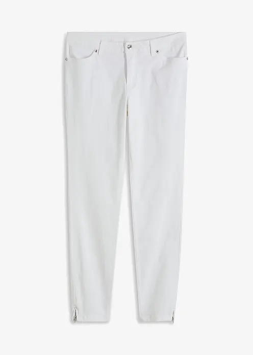 Die mit vier Taschen versehene, schmal geschnittene Stretchhose überzeugt mit ihrem Kombinationsfaktor. Kleine Reißverschlüsse am Beinende setzen einen modischen Akzent. Das ansprechende Modell von BODYFLIRT bietet die Basis für abwechslungsreiche Looks.Ein schickes Outfit gelingt mit Bluse, Blazer und Pumps. Eine lässige Note erhält die Stretchhose mit einem locker fallenden Strickpullover in Oversize und Metallic-Boots. Für einen verspielten Charme sorgt eine bunt gemusterte Tunikabluse.