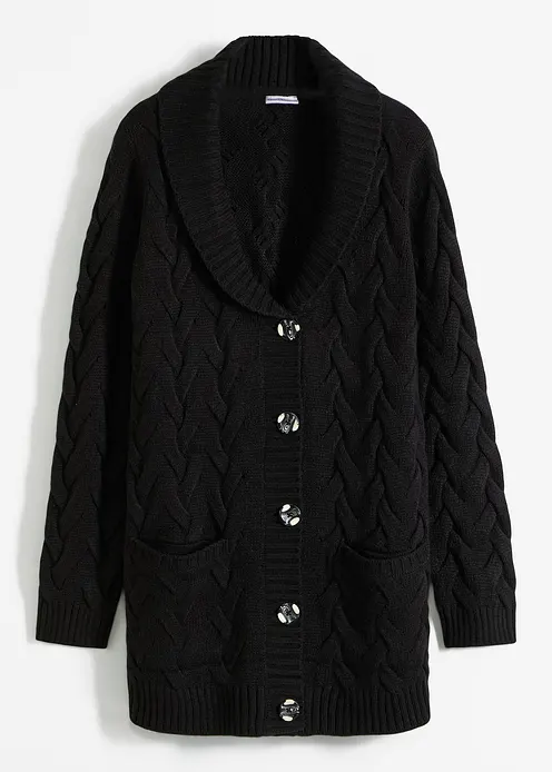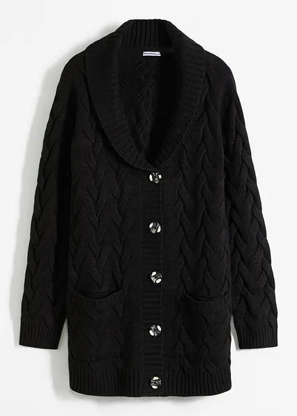 Longstrickjacke mit Schalkragen und Zopfmuster