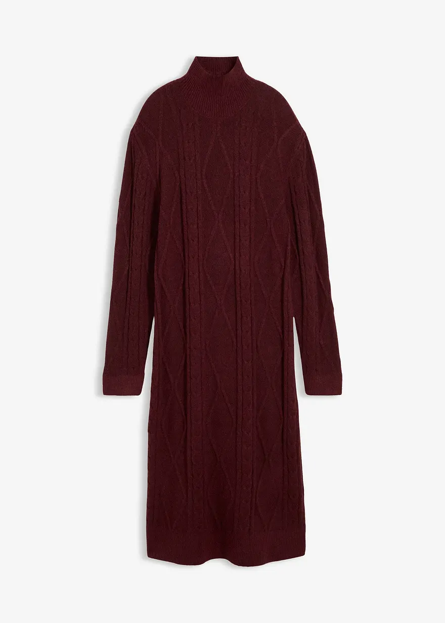 Langes Strickkleid in weiter Passform mit Zopfmuster. Mit hoch geschnittenem Kragen und überschnittener Schulter.