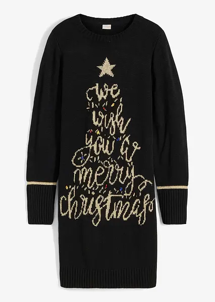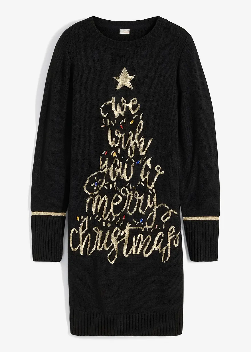 Feminines Strickkleid mit süßem Weihnachtsmotiv. Länge in Größe 36/38 ca. 90 cm.