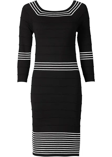 Dieses Strickkleid der Marke BODYFLIRT unterstreicht die feminine Ausstrahlung. Das kurze Kleid mit 3/4-Ärmeln aus angenehm weicher Strickware betont die weibliche Silhouette. Die Streifen am Carmen-Ausschnitt sowie in der Taille, an den Ärmeln und am Saum setzen schöne Akzente.Komplettieren Sie dieses Strickkleid mit Pumps sowie mit schickem Arm- und Halsschmuck.