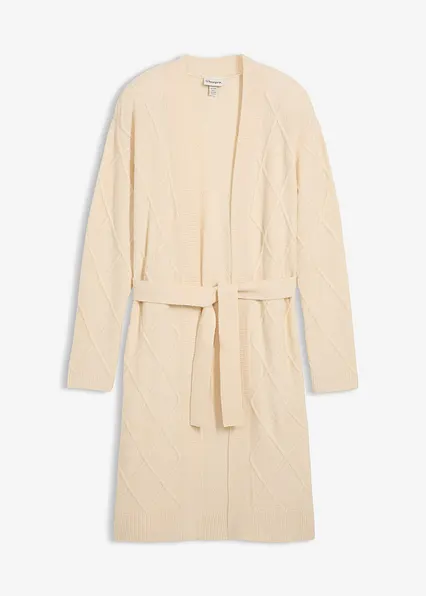Langer Strickmantel aus Zopfstrick. Modell mit überschnittenen Schultern und Bindegürtel.