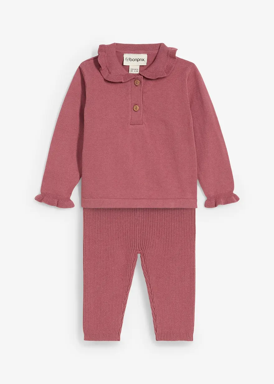 Kuscheliger Strickpullover mit Volantkragen und Leggings für kleine Fashionistas! Dieses stilvolle Set verleiht jedem Outfit einen besonderen Touch. Der weiche Strickpullover mit charmantem Volantkragen und Volants an den Ärmeln sorgt für einen eleganten Look, während die passende Leggings für einen bequemen Sitz und viel Bewegungsfreiheit sorgt – ideal für den aktiven Alltag deines Kindes.Mit diesem Set haben Babys sofort ein zauberhaftes Outfit, das perfekt für Spielen, Ausflüge oder besondere Anlässe geeignet ist. Hergestellt aus einem hochwertigen Baumwoll-Mix, sorgt der Anteil an synthetischen Fasern für weniger Pilling und ein angenehmes Hautgefühl. Eine tolle Wahl für modebewusste kleine Entdeckerinnen!