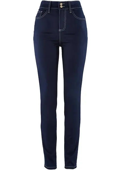 5-Pocket Jeans mit hohem Bund mit seitlichem Gummizug und zwei Knöpfen. Auf der Rückseite schräg verlaufenden Seitennähte für einen Push-Up-Effekt. Dünnes sehr elastischen Material.
