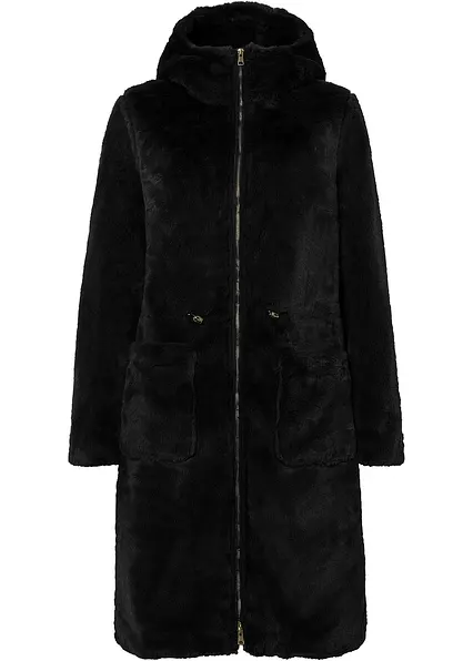 Kuscheliger Wintermantel aus Teddyfell mit großen Taschen und Kaputze