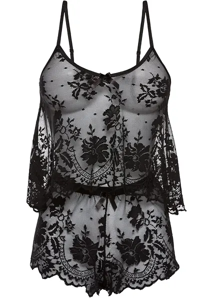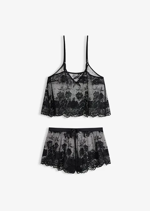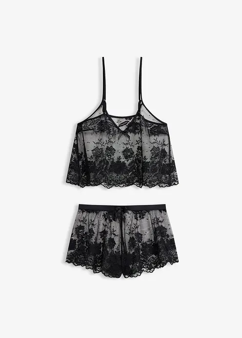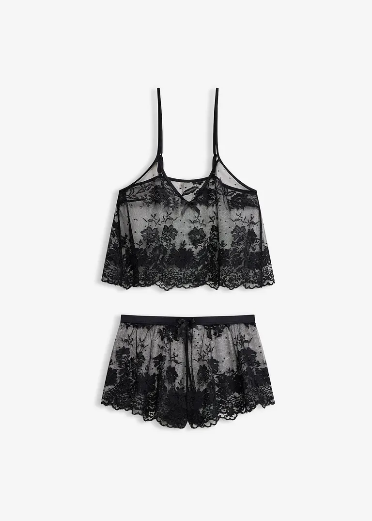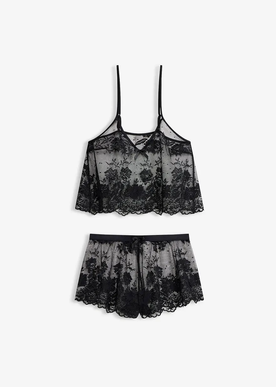 Der feminine Zweiteiler aus Spitzentop mit dazu passender Panty umspielt Ihre Kurven durch eine sanfte Spitze und bietet ein angenehmes Tragegefühl. Als aufwertendes Accessoire dient eine Zierschleife am Ausschnitt des Tops und in der Mitte des Bundes der Panty. Die Transparenz des Stoffes gibt Lust auf mehr und zieht die Blick Ihres Partners auf Sie.