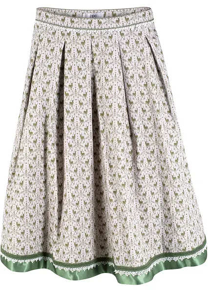 Dieser stilvolle Trachtenrock überzeugt mit seiner Teller-Silhouette. Das komfortable Modell erhält mit dem ausgestellten Saum einen attraktiven Schwung und sieht zugleich sehr edel aus. Zu einem dezenten Hirschmuster gesellt sich am Saum eine dekorative Satinbordüre. Vom breiten Bund gehen ansprechende Falten aus. Ein schön taillierter Blazer und dezente Pumps bringen diesen stylishen Trachtenrock aus Baumwollqualität von bpc fantastisch zur Geltung.Länge von ca. 58 cm (Gr.38) - 62 cm (Gr.56), maschinenwaschbar.