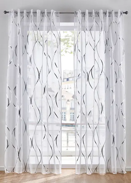 Moderne Gardine aus transparentem Stoff mit leichter Struktur. Moderner Glanz Druck. Einfach mit den verdeckten Schlaufen an der Gardinenstange anbringen.