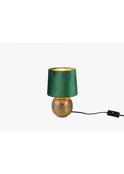 Garantiert ein Blickfang! Diese Tischleuchte erscheint im modernen und auffälligen Design und zieht damit alle Blicke auf sich. Ob als Nachttischleuchte im Schlafzimmer, auf der Kommode oder auf dem Beistelltisch im Wohnzimmer, die Tischleuchte setzt dekorative Akzente. Gleichzeitig wird über den Lampenschirm ein warmes und sanftes Licht abgegeben, das für eine angenehme Lichtstimmung sorgt. Die Leuchte ist mit einem Schnurschalter ausgestattet, wodurch sie leicht ein- und ausschaltbar ist. Die Kombination, aus Keramik in Gold und dem Stoffschirm in Grün, sorgt für ein modernes Erscheinungsbild. Für eine energiesparende Beleuchtung empfiehlt sich die Verwendung eines LED Leuchtmittels. Diese sind eine optimale Alternative zu herkömmlichen Halogen Leuchtmitteln und stehen für eine hohe Lichtqualität und eine Energieeinsparung von bis zu 80%. Zusätzlich stehen LED Leuchtmittel für eine lange Lebensdauer, einer geringen Wärmeentwicklung und schonen gleichzeitig die Umwelt.