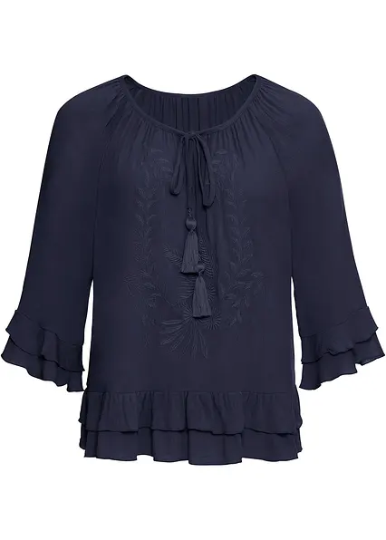 Die schöne Bluse im leichten Boho Look ist mit gleichfarbiger Stickerei besetz. Die Volants am Saum machen die Bluse zu einer ganz besonderen. Die Bluse hat einen Rundhalsausschnitt und Bindebänder.