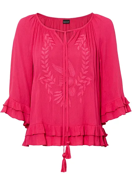 Die schöne Bluse im leichten Boho Look ist mit gleichfarbiger Stickerei besetz. Die Volants am Saum machen die Bluse zu einer ganz besonderen. Die Bluse hat einen Rundhalsausschnitt und Bindebänder.