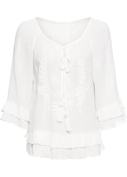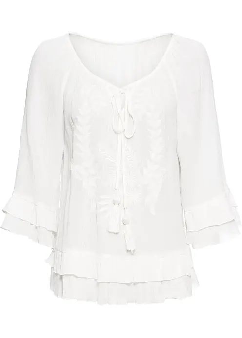 Die schöne Bluse im leichten Boho Look ist mit gleichfarbiger Stickerei besetz. Die Volants am Saum machen die Bluse zu einer ganz besonderen. Die Bluse hat einen Rundhalsausschnitt und Bindebänder.