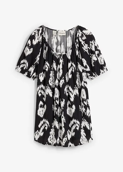 Tunikabluse aus leicht strukturierter Viskose. Mit elastischem Abschluss am Ärmelbündchen und leichtem A-Shape.