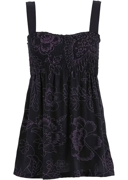 Breite Träger und eine den Körper umspielende Passform charakterisieren dieses Tunikatop. Im Fokus steht der gesmokte Einsatz im Brustbereich. Von dort aus fällt der Stoff locker herab. Das charmante Tunikatop von BODYFLIRT ist vielseitig einsetzbar. Es überzeugt zu 7/8-Jeans und Sandalen. Shorts oder ein Minirock im coolen Denim-Look stehen ihm ebenfalls großartig.