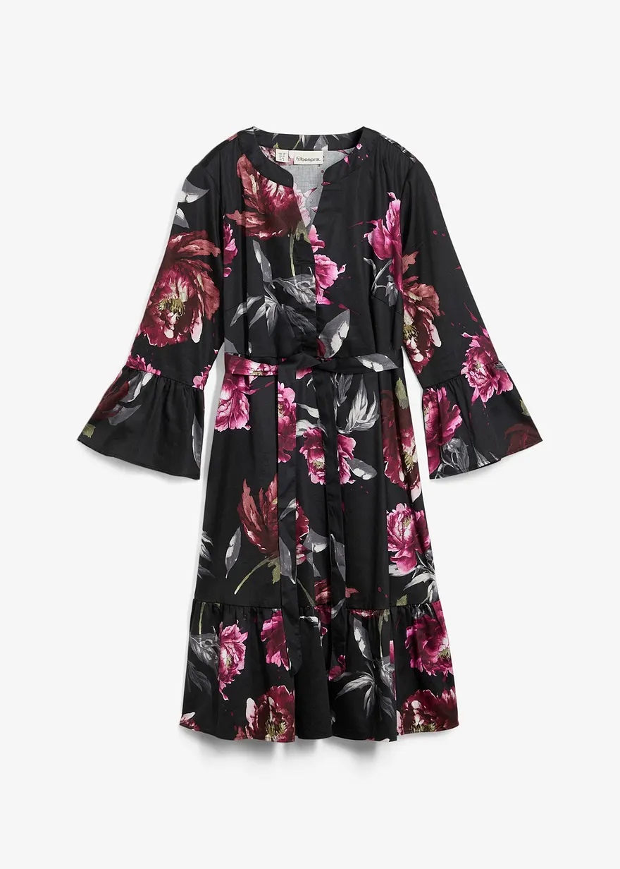 Knieumspielendes Blusenkleid aus weicher, fließender Baumwolle mit edlem Glanz. Mit Rundhalsausschnitt, kleinem Stehkragen und verlängerter Knopfleiste, die ein einfaches Stillen ermöglicht. Die Ärmel und der Rocksaum sind mit einem Volant versehen. Ein abnehmbares Bindeband ermöglicht die individuelle Weitenregulierung der Taille und sorgt für eine schmeichelnde Silhouette.