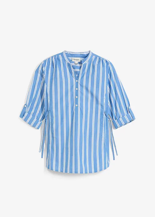 Schrittbedeckende Popelin-Bluse aus hochwertiger Bio-Baumwolle überzeugt durch ihren zeitlosen Stehkragen und die praktische Knopfleiste, die ein unkompliziertes Stillen ermöglicht. Die seitlichen Bindebänder erlauben eine individuelle Anpassung der Bauchweite und sorgen dafür, dass die Bluse auch nach der Schwangerschaft noch perfekt sitzt. Die Ärmel lassen sich dank Manschetten und Knopf zum Krempeln flexibel tragen, während der abgerundete Saum das Gesamtbild stilvoll abrundet.