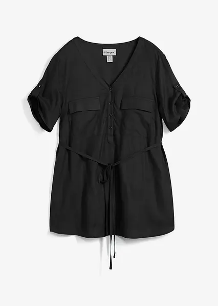 Leichte Umstandsbluse aus Viskose mit abnehmbarem Bindeband und Pattentaschen auf der Vorderseite. Mit V-Ausschnitt und halblanger Knopfleiste zum Stillen. Die halblangen Ärmel lassen sich durch Riemen und Knöpfe in der Länge regulieren.