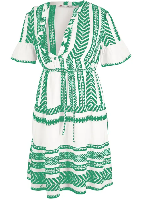 Tunika-Kleid aus gewebter Viskose mit Rundhalsausschnitt und langer Knopfleiste, die ein einfaches Stillen ermöglicht. Die halblangen Ärmel sind mit Volants verziert und der Rock in A-Linie ist in mehreren Stufen genäht und sorgt für einen eleganten Fall. Das abnehmbare Bindeband dient der Regulierung der Weite.