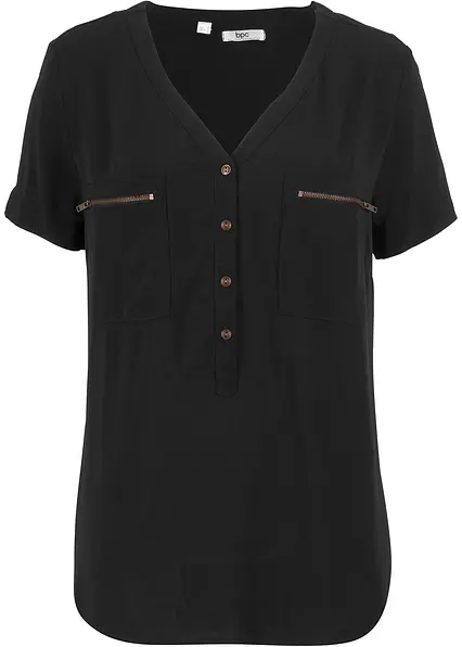 Die lockere Schnittform und die angenehme Viskose-Qualität machen diese Bluse von bpc zu einem gern getragenen Kleidungsstück für den Alltag. Der ansprechende V-Ausschnitt setzt sich in einer kleinen Knopfleiste fort, mit deren Hilfe er sich individuell regulieren lässt. Als weitere Blickfänger dienen die beiden Brusttaschen mit Reißverschluss.Der leicht abgerundete rückwärtige Saum komplettiert das attraktive Design der Viskose-Bluse mit halblangen Ärmeln.