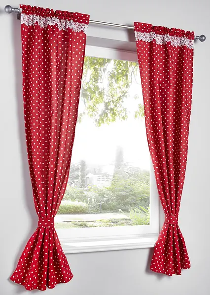Der Vorhang besitzt ein gepunktetes Muster. Ein besonderer Hingucker ist die raffinierte Spitzenborte unter dem Tunnelzug. Der tolle Landhaus-Vorhang lässt sich dadurch ganz einfach auf einer Gardinenstange aufhängen. Die Lieferung besteht aus zwei Vorhangschals und zwei farblich passenden Raffhaltern.
