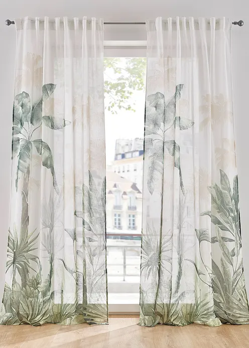Möchtest du den Dschungel zu dir nach Hause holen? Dann ist dieser blickdichte Vorhang genau richtig! Der Stoff mit den digital bedruckten Palmenblätter hat eine leichte Struktur.