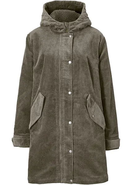 Modischer Parka aus Cord mit kuscheligem Teddy-Futter in der Kapuze in kaschierender Länge.