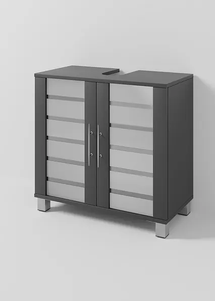 In einem geradlinigen Design präsentiert sich der moderne Waschbeckenunterschrank "Ted". Er bietet großzügigen Stauraum bei minimalem Platzanspruch. Hygieneartikel, Kosmetika und vieles mehr finden so eine griffbereite Verwahrung. Das schafft Ordnung und ein entspanntes Ambiente in der heimischen Wohlfühloase. Optisch begeistert das Badmöbel mit stylishen Glastüren, die teilweise gefrostet sind und so einen dezenten Sichtschutz bieten. Passend dazu sind die formschönen Griffe in Chromoptik gewählt. Eine rundum tolle Lösung für kleine und große Bäder oder auch im Gäste-WC: der moderne Waschbeckenunterschrank "Ted".