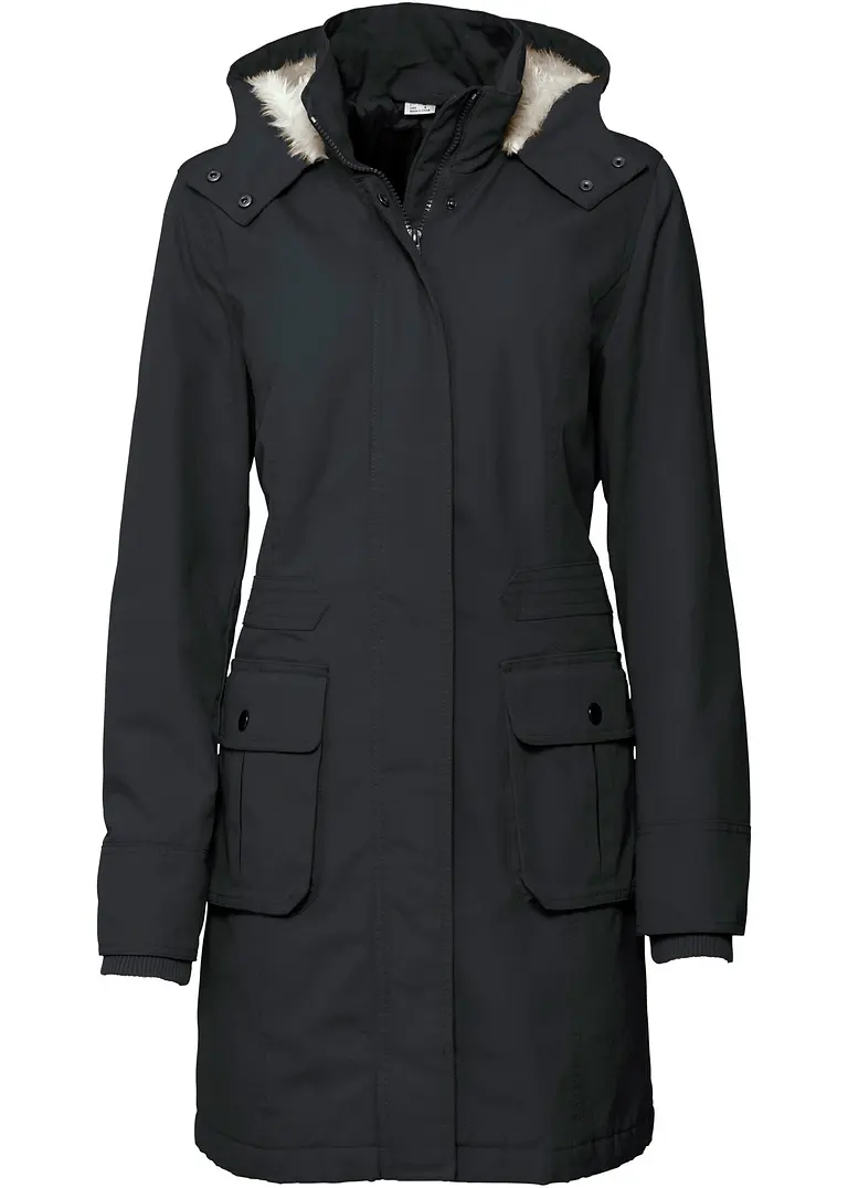 Der sportive Parka der Marke bpc überzeugt vor allem mit seiner kuscheligen Kapuze aus konstrastfarbigem Kunstfell sowie den vielen praktischen Taschen: Auf der Vorderseite bieten zwei aufgesetzte Taschen und zwei Reißverschlusstaschen im Brustbereich Platz für Geldbörse, Schlüssel oder Handy.Die weichen Rippbündchen an den Ärmeln sorgen für einen guten Sitz und viel Schutz auch bei nass-kalten Temperaturen.