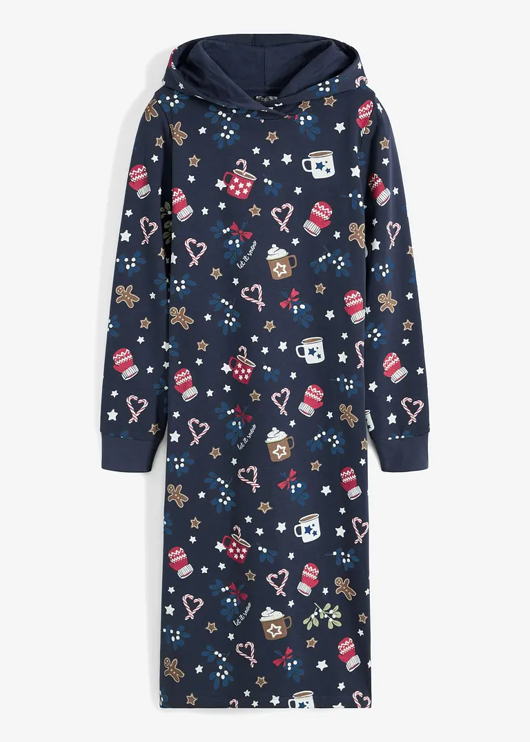 Weihnachtlich bedrucktes Sweatkleid mit Kaputze und Seitenschlitzen