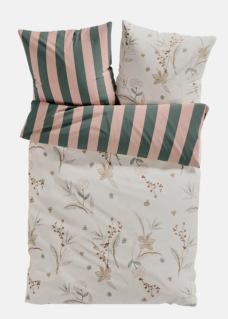 Diese elegante Wendebettwäsche kombiniert romantische Blütenmuster mit stilvollen Streifen und bietet zwei Looks in einem