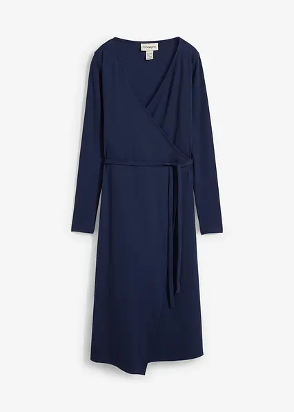 Umstandskleid aus geripptem Baumwoll-Jersey mit etwas Elasthan für einen angenehmen Tragekomfort auf der Haut. Das wadenlange Kleid hat einen Wickelschnitt mit V-Ausschnitt. Ein Einsatz ermöglicht ein einfaches sowie diskretes Stillen. Bindebänder in der Taille dienen der Regulierung der Weite.