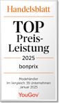 Nach mehr als 900.000 Interviews mit rund 872 Markenbeurteilungen zeichnet das Handelsblatt die Preis-Leistung von bonprix mit einer TOP-Bewertung in der Kategorie „Modehändler“ aus.
